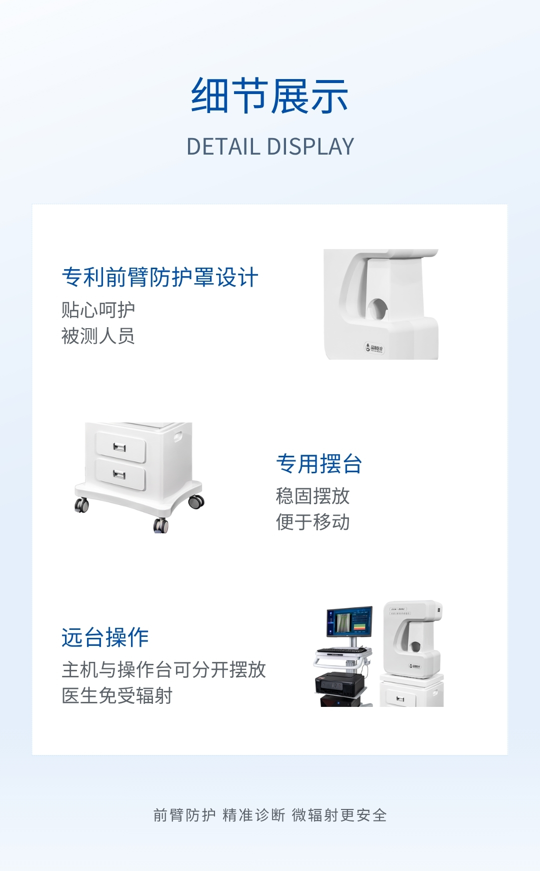 DXA- 800E 雙能 X 線骨密度儀測量手臂前段,這些部位易顯露,操作簡捷,無需消毒。測量速度快,方便醫(yī)生及病人,可用于大人群檢測。